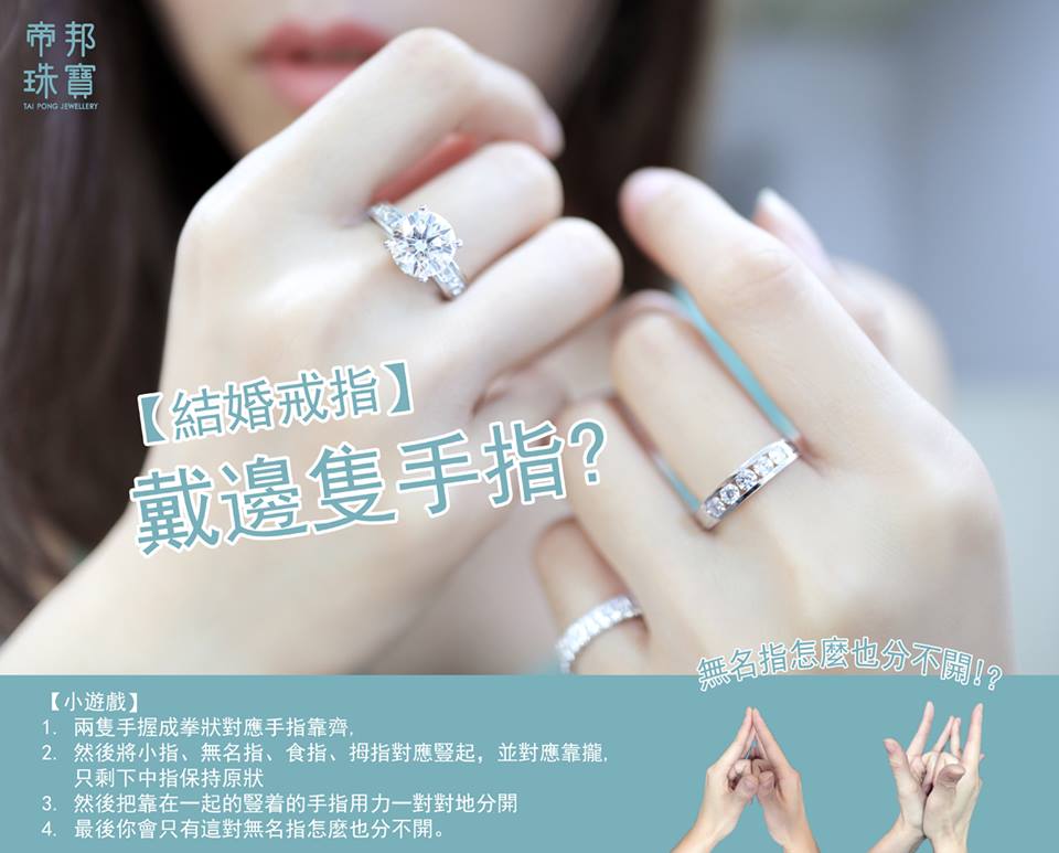 十隻手指都可以戴戒指, 大家知道背後的意義嗎? 相信大家都有聽過“追、求、訂、結、離”, 代表著不同手指配戴戒指的意義。追大姆指:正在被追求的意思求食指:求愛,或I am available訂中指:訂婚或已經有戀愛對象.